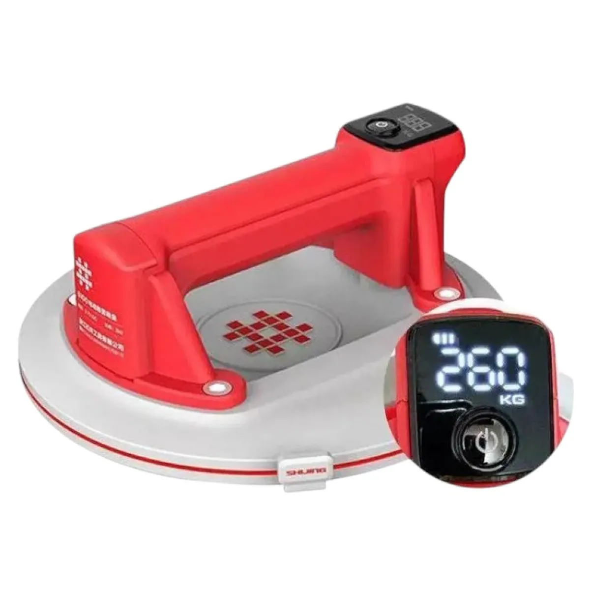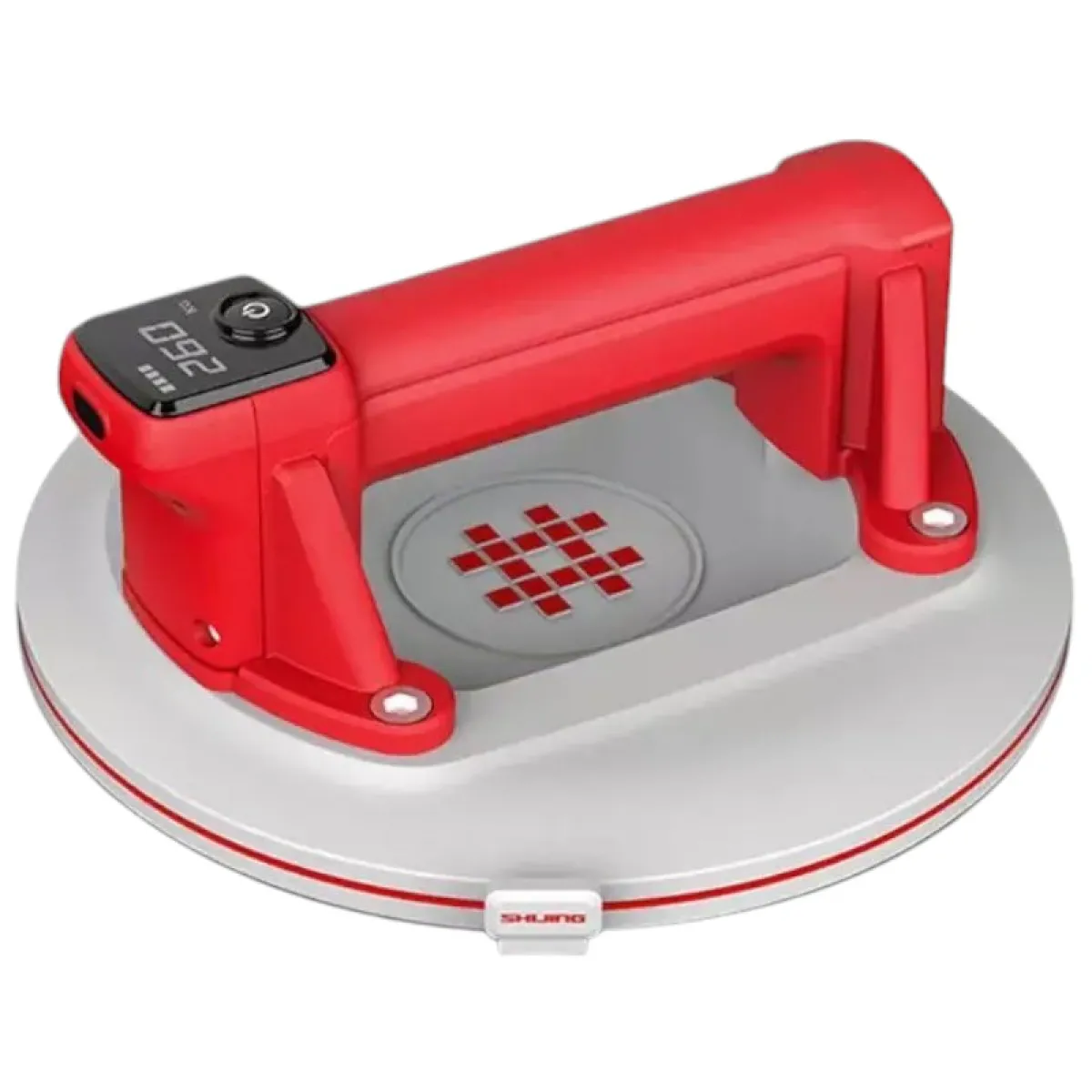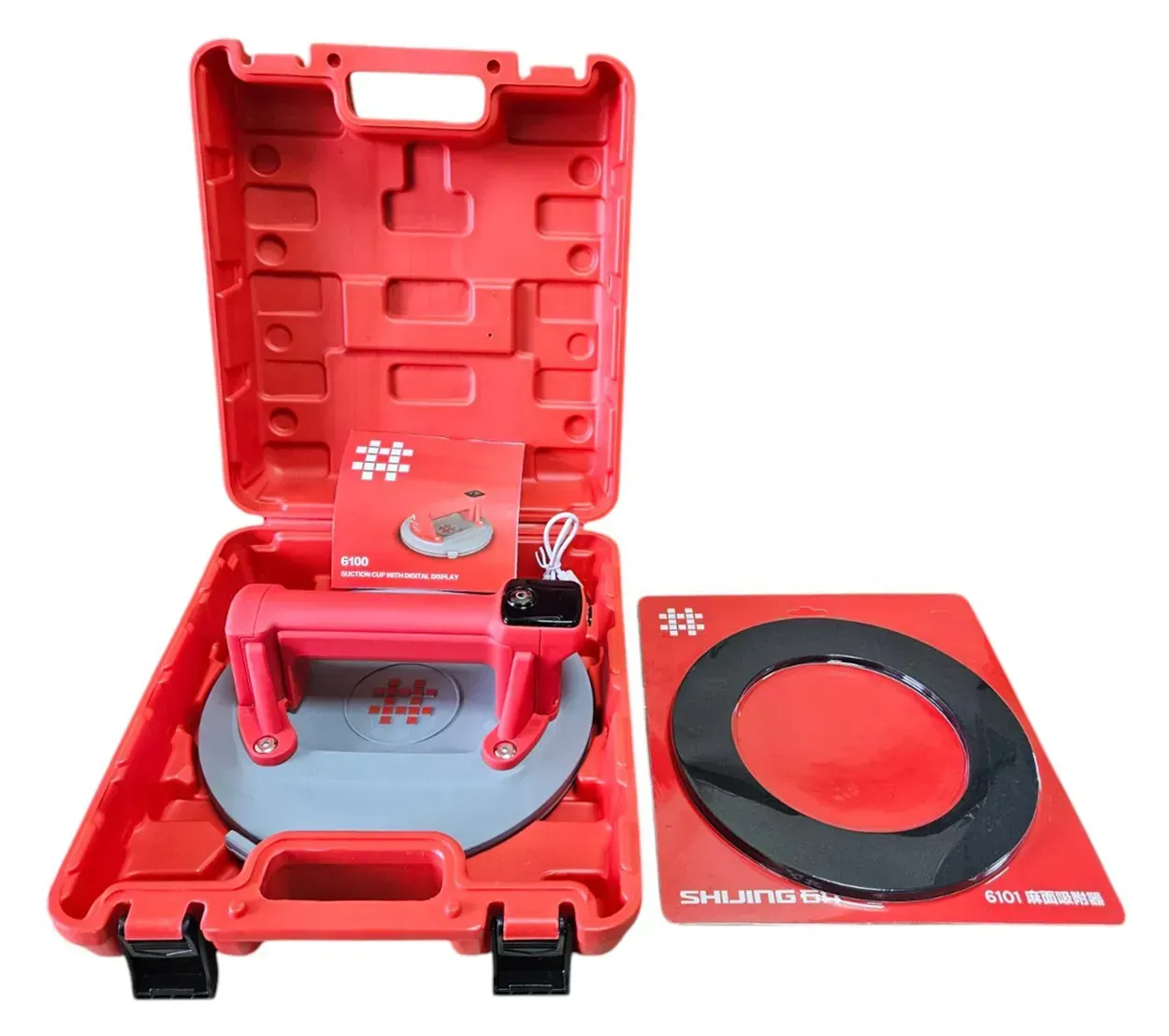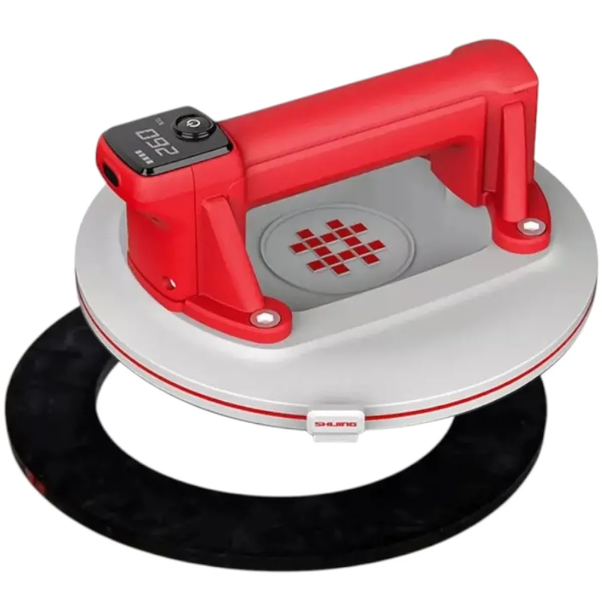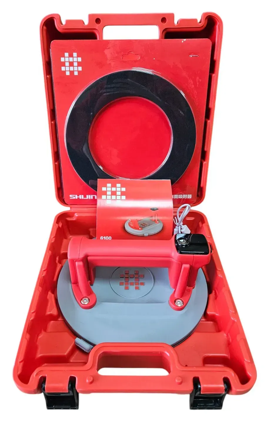 SHIJING 6100 — електрична вакуумна присоска з автоматичною підкачкою та цифровим дисплеєм для безпечного підйому й позиціонування плитки, скла та інших листових матеріалів. Робочий діаметр 220 мм забезпечує велику площу контакту, а додаткове гумове кільце 6101 допомагає краще тримати на злегка шорстких поверхнях